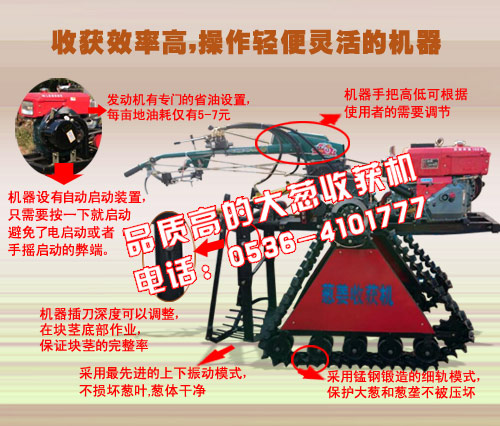 大蔥收獲機是我公司吸收國內(nèi)外最先進技術(shù),研制開發(fā)的新一代蔥姜收獲設(shè)備,是目前世界上非常先進的收獲大蔥、鮮姜的自動化根莖類收貨機械。適用于大鮮姜、大蔥、芋頭、土豆的收獲,具有自動振土,省時、省力、省錢的優(yōu)點,并且具有不漏收,損耗率低,等優(yōu)點比傳統(tǒng)人工收貨提高10倍以上,符合現(xiàn)代化農(nóng)業(yè)發(fā)展趨勢,是你發(fā)家致富的得力助手。